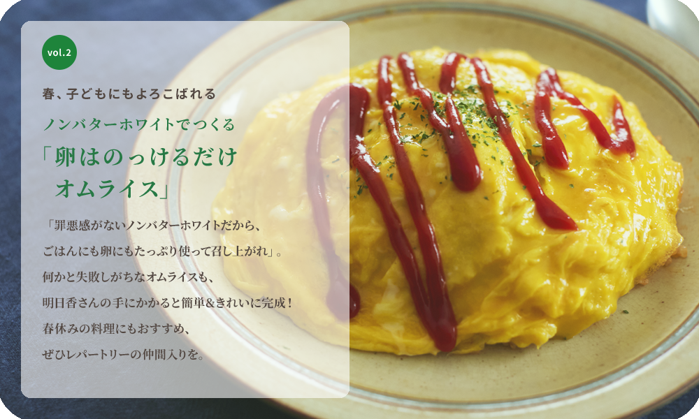 「罪悪感がないノンバターホワイトだから、ごはんにも卵にもたっぷり使って召し上がれ」。